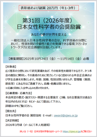 第31回(2026年度)日本女性科学者の会奨励賞の募集について