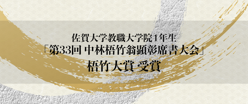 佐賀県小城市出身の偉大な書家・中林梧竹(なかばやしごちく)翁を顕彰するために開催されている書道大会「第33回 中林梧竹翁顕彰席書大会」にて、佐賀大学教職大学院1年生が最高賞である「梧竹大賞」を受賞しました。また農学部の学部生が「特選」、教育学部の学部生が「秀作」として受賞。みなさん、おめでとうございます!受賞作品は、令和7年8月19日(火)~8月31日(日)まで桜城館に展示されました。詳しくは下記をご覧ください。