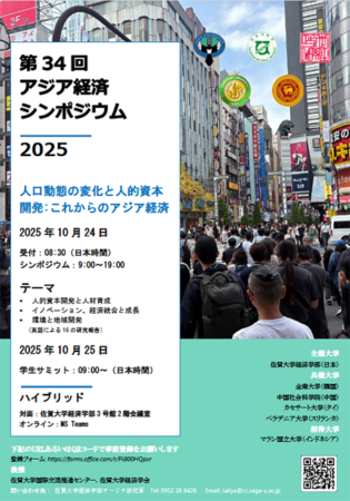 佐賀大学経済学部より「第34回アジア経済シンポジウム」開催のお知らせです。今回は、テーマを『人口動態の変化と人的資本開発:これからのアジア経済』として開催。また学生サミットも開催されます。詳しい内容や申し込みについては、下記をご覧ください。