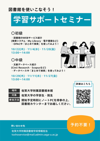 佐賀大学附属図書館 本館より、学部生、大学院生のみなさんへ。「図書館の使い方がよくわからない」「レポートを書くときに、どう資料を探せばいいのかわからない」と困ったことはありませんか? 佐賀大学附属図書館 本館では、10月~11月に、図書館職員による学習サポートセミナーを実施します。初級編、中級の2コースをご準備。詳しい内容や日程、参加方法については下記をご覧ください。