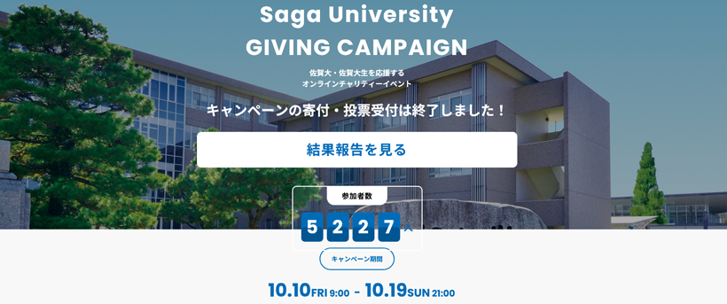 佐賀大学では、学生の研究活動や課外活動の応援・支援を目的に、学生団体による活動資金調達を行うオンラインチャリティーイベント「Saga University Giving Campaign 2025」に10月10日(金)から19日(日)まで参加いたしました。このイベントは、文部科学省後援のうえ、佐賀大学を含む全国の国公私立大学110大学にて同時開催されたものです。