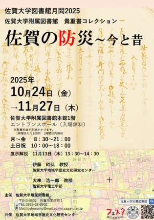 地域学歴史文化研究センターとの共催で、貴重書小城鍋島文庫や市場直次郎コレクション等を附属図書館本館エントランスホールにて展示します。今回は貴重書の展示とあわせて現代の防災研究についても紹介します。