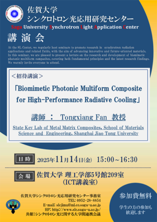 佐賀大学シンクロトロン光応用研究センターより、講演会開催のお知らせです。シンクロトロン光応用研究センターでは、革新的マテリアルや未来型新素材の研究進展を目指して、シンクロトロン光応用ならびに関連する分野での研究の進展について定期的に講演会を開催しています。今回は Tongxiang Fan 教授をお迎えし講演いただきます。学生の方の参加も歓迎。詳しくは下記をご覧ください。