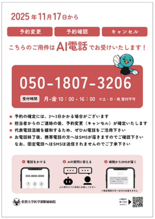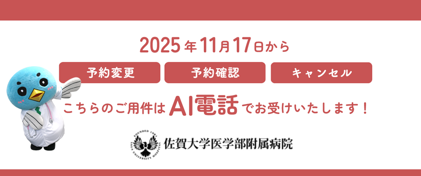 佐賀大学医学部附属病院よりお知らせです。2025年11月17日(月)から予約変更・予約確認・キャンセルは、AI電話でお受けいたします。代表電話混雑を緩和するため、ぜひAI電話をご利用ください。詳しくは下記をご覧ください。