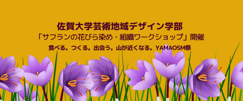 佐賀県さが創生推進課主催で「食べる。つくる。出会う。山が近くなる。YAMAOSM祭」が開催されます。これは「佐賀の山」の価値を身近な暮らしの延長に感じてもらい、それぞれの関わり方で佐賀の山とつながってもらうことを目指すことを目的としたものです。このイベントにて、佐賀大学芸術地域デザイン学部が「サフランの花びら染め・組織ワークショップ」を開催いたします。山で育つサフランを使って和紙を染める体験と、染めた素材を使った組織体験をしてみませんか。詳しくは下記をご覧ください。