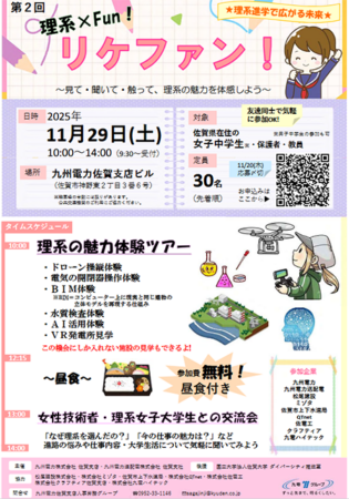 佐賀大学ダイバーシティ推進室より、「理系×Fun!リケファン!~見て・聞いて・触って、理系の魅力を体感しよう~」(主催:九州電力佐賀支店・九州電力送配電佐賀支社)参加者募集のお知らせです。このイベントは、佐賀県内の企業が複数参加し、佐賀大学ダイバーシティ推進室も共催で参加します。ドローン操縦体験やBIM(注2)体験など、理系に関する仕事の魅力や楽しさを体感できる体験型できる!また、理系への進路選択の際に生じる迷いや不安の解消に繋げるために、女性技術者・理系学部に在籍する女子大学生との懇談会を実施し、技術者・研究者としての活躍可能性やロールモデルを示すとともに、理系の幅広い業種や学部の魅力をお伝えするイベントです。当日は、佐賀大学からも理系女子大学生が参加し、お話しができますよ!詳しい内容や申し込みについては下記をご覧ください。