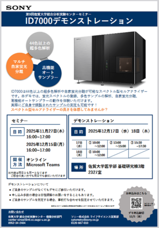 お知らせです。ID7000は44色以上の超多色解析や自家蛍光分離が可能なスペクトル型セルアナライザーです。本デモでは、蛍光スペクトルの登録、多色サンプルの解析、自家蛍光分離、高機能オートサンプラーの動作を体験いただけます。実際にご自身で調製されたサンプルの測定も可能です!