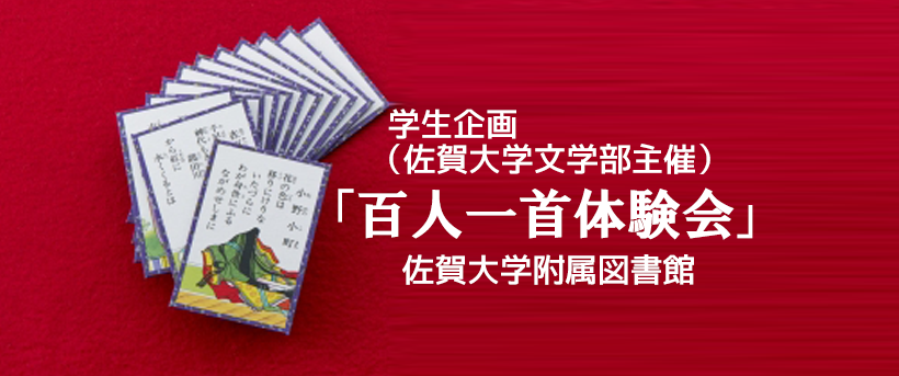 NEW 2025.12.01 佐賀大学附属図書館より 学生企画「百人一首体験会」開催! 佐賀大学附属図書館より、学生企画イベント「百人一首体験会」開催のお知らせです。このイベントは佐賀大学文芸部の学生が企画実施するもので、百人一首を使った遊びを行います。百人一首に触れたことがない人も大歓迎です!ぜひ会場へお越しください。一緒に百人一首を楽しみましょう! 学生企画「百人一首体験会」(佐賀大学文学部主催)日時:12月3日(水)/12月4日(木)両日とも17:00~19時頃まで場所:佐賀大学附属図書館4階 多目的室学習スペース対象:どなたでも歓迎(出入自由) Tag : #イベント, #お知らせ, #サークル, #佐賀大学, #佐賀大学附属図書館, #学生の活動 タグ一覧へ 前の記事 一覧へ 次の記事