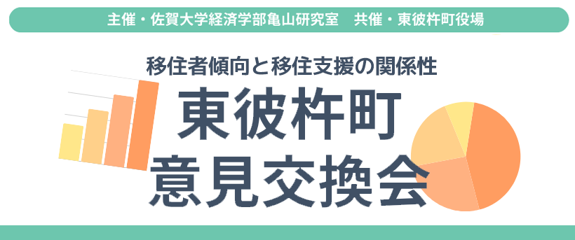 佐賀大学経済学部亀山研究室(教授:亀山嘉大)の学生グループが、長崎県東彼杵町にて「東彼杵町意見交換会~移住者傾向と移住支援の関係性~」を開催。本学生グループは、東彼杵町への移住者と東彼杵町内で行われている移住支援の施策・活動がどのような関係性を持っているのか分析を行ってきました。意見交換会では我々学生が分析結果を基に東彼杵町の更なる定住人口増加につながる施策案の一例を提案し、東彼杵町役場の方と東彼杵町移住コーディネイターの方と三者間でその効果と実現可能性について話し合います。詳しくは下記をご覧ください。