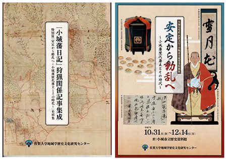 佐賀大学地域学歴史文化研究センターより刊行物のお知らせです。佐賀大学・小城市交流事業特別展「安定から動乱へ~小城藩歴代藩主とその時代~」」(10月31日~12月14日開催)の図録と史料集を刊行。図録には、展示史料全点の画像、および展示用に作成したパネルを掲載しています。また史料集には、佐賀大学附属図書館所蔵小城鍋島文庫の「小城鍋島文庫」から、歴代藩主の狩猟にかんする記事を抄録しています。佐賀大学地域学歴史文化研究センターホームページをご覧ください。