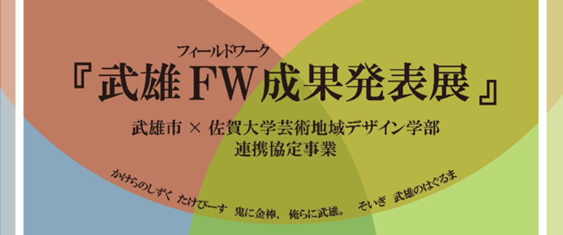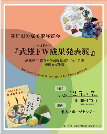 武雄市民がつくる芸術の祭典「たけお芸術祭」が2025年12月5日~12月7日に開催されます。この芸術祭にて、佐賀大学芸術地域デザイン学部のフィールドワーク成果発表展も実施されます。令和4年4月27日に締結した佐賀大学芸術地域デザイン学部と武雄市との連携協定に基づき、山口夕妃子教授が担当する講義の一環として、武雄市をフィールドにした「武雄FW講義」の成果展となるものです。
