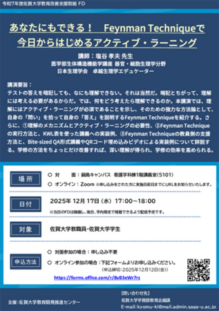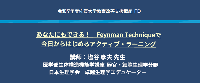 佐賀大学教職員・在学生のみなさんへ。教育改善支援取組FD講演会「あなたにもできる! Feynma Techniqueで今日からはじめるアクティブ・ラーニング」(主催:佐賀大学教育開発推進センター)開催のお知らせです。講師に医学部の塩谷先生にご登壇いただき、「暗記ではなく“理解”を深めるためのアクティブ・ラーニング」、「Feynman Technique を活用した授業の工夫」など、教育現場で実際に取り組まれた具体的なアイデアや成果を、分かりやすくご紹介いただきます。教育の質向上や授業改善に関心のある教職員の皆さま、ぜひご参加ください。また、今回の講演は学生側の学修改善をテーマにしておりますので、学修改善や理解の向上を求める学生の皆さまもぜひご参加ください。