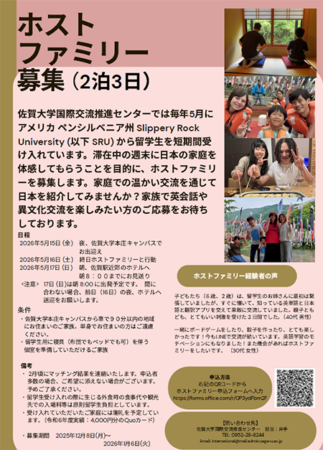 佐賀大学国際交流推進センターより「スリッパリー大学ホストファミリー募集」のお知らせです。佐賀大学国際交流推進センターでは毎年5月にアメリカ ペンシルベニア州 Slippery Rock University (以下 SRU) から留学生を短期間受け入れています。滞在中の週末に日本の家庭を体感してもらうことを目的に、ホストファミリーを募集します。家庭での温かい交流を通じて日本を紹介してみませんか?家族で英会話や異文化交流を楽しみたい方のご応募をお待ちしております。詳しくは下記をご覧ください。