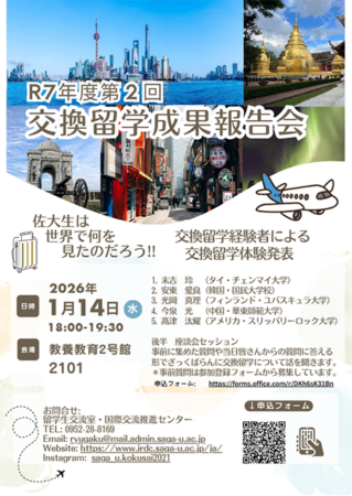 佐賀大学留学生交流室・国際交流推進センターより在学生のみなさんへ。「令和7年度第2回交換留学成果報告会」開催のお知らせです。交換留学には十人十色のストーリーがあります!実際に留学した先輩のストーリーを聞いて、あなたの描く留学に向けて準備を進めよう!詳しい内容や参加登録については下記をご覧ください。当日参加もOKです。