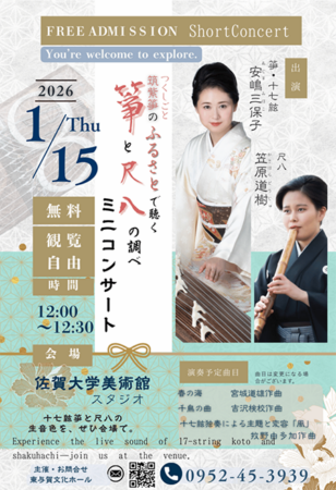 佐賀大学美術館において「令和7年度公共ホール邦楽活性化事業アクティビティ 和楽器(箏と尺八)ミニコンサート・レクチャー」が新年に開催されます。主催は公益財団法人佐賀市文化振興財団 東与賀文化ホール。現代では、日頃あまり触れる機会が少ない邦楽を身近に感じていただく箏の演奏と箏のルーツは佐賀に由来する「筑紫箏」であることをご紹介いたします。
