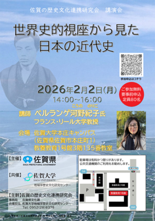 佐賀の歴史文化連携研究会(事務局:佐賀県文化課、会場担当:佐賀大学地域学歴史文化研究センター)では、佐賀の幕末維新期を重点的に取り組む研究分野として捉えています。今回は、佐賀大学と大学間学術交流協定を締結しているフランスのリール大学の教授である、ベルランゲ河野紀子先生のご来日に合わせて、講演会を開催いたします。先生は、変動する19世紀以降の日本の知の姿について、江藤新平らを切り口にして、グローバルな視点をもって、ご研究に取り組んでおられます。地域でご関心をお持ちの方が多く、本会にとっても重要なテーマについて、ご参加の皆様の知見を広げるべく、本講演会を企画いたしました。ふるってご参加ください。詳しい内容やお申込みについては下記をご覧ください。