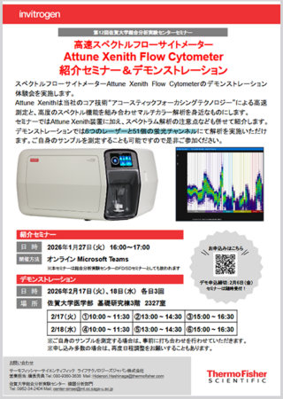 佐賀大学総合分析実験センターより「スペクトルフローサイトメーターAttune Xenith」紹介セミナー&デモンストレーション開催のお知らせです。独自のアコースティックフォーカシング技術による高速測定と、6レーザー・51蛍光チャンネルの高度なスペクトル解析機能を組み合わせ、マルチカラー解析の可能性を広げます。このセミナーでは装置紹介に加え、スペクトラム解析の注意点も解説していただきます。またデモンストレーションではご自身のサンプル測定も可能です。最新機種に直接触れ、解析力向上を体験いただける絶好の機会、ぜひご参加ください。詳しい内容や参加方法については下記をご覧ください。
