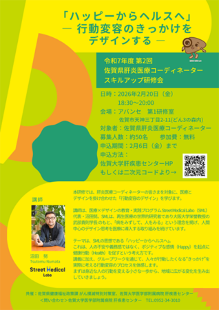 佐賀大学医学部附属病院 肝疾患センターより佐賀県肝炎医療コーディネーター対象に「令和7年度 第2回 佐賀県肝炎医療コーディネーター」スキルアップ研修会開催のお知らせです。今回のテーマは、「ハッピーからヘルスへ」― 行動変容のきっかけをデザインする ―。医療×デザインの専門家・沼田努氏(Street Medical Labo代表)による講義とグループワークです。詳しい内容や参加方法については下記をご覧ください。
