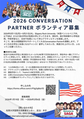 2026年5月にアメリカ・スリッパリーロック大学の学生が佐賀大学にやってきます。滞在中は日本や佐賀について学ぶアクティビティを実施します。そこで彼らの短期留学をサポートしてくれるConversation Partner募集を募集します。詳しい内容や応募については下記をご覧ください。