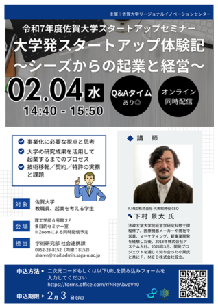 佐賀大学リージョナル・イノベーションセンターより、セミナー「大学発スタートアップ体験記〜シーズからの起業と経営~」開催のお知らせです。今回は大学発スタートアップとして実際に創業し、事業化および資金調達を進めてこられたF.MED株式会社 代表取締役CEO 下村 景太 氏をお招きし、スタートアップセミナーを開催します。このセミナーでは、研究成果をもとにした起業の準備段階から、事業計画書の策定AMED事業採択を契機とした起業の経緯、さらにはシード期からシリーズAに至る資金達の実例についてご講演いただきます。詳しい内容や参加申し込みについては下記をご覧ください。