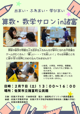 佐賀大学大学院学校教育学研究科・教育学部の米田・大林研究室による「算数・数学サロン in 諸富」を下記の日程で開催いたします。このイベントは諸富町ボランティア推進協議会による協力、佐賀大学教育学部・学校教育学研究科・佐賀市教育委員会による後援となっています。「算数・数学との感動的な出合い、心に残る数学体験」をコンセプトに、諸富中学校区の児童生徒が主体的に数学的に探究できるような問題を準備し、佐賀大学の学生と諸富町ボランティア推進協議会が協力して児童の支援を行います。地域貢献と学生の教育の両面で意義ある活動となることを期待しています。ぜひご参加ください。詳しくは下記をご覧ください。