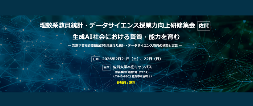 佐賀大学教養教育センターより「理数系教員統計・データサイエンス授業力向上研修集会(佐賀)」開催のお知らせです。大学改革の現在、および、探究の質的向上を数学・情報が支える次期の学習指導要領改訂の方向、大学における数理データサイエンス AI 教育との接続強化などが論点に上がっております。ご関心のある先生方には、ぜひご参加をお願い申し上げます。詳しい内容や申し込みについては下記をご覧ください。