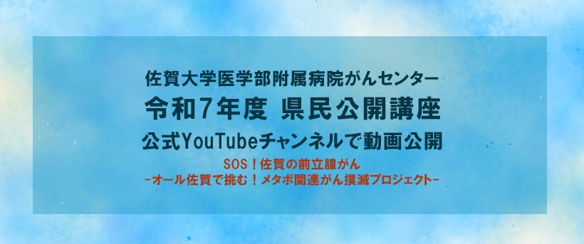 佐賀大学医学部附属病院より「令和7年度 佐賀大学医学部附属病院がんセンター県民公開講座」の動画公開のお知らせです。令和7年度のテーマは「SOS!佐賀の前立腺がん-オール佐賀で挑む!メタボ関連がん撲滅プロジェクト-」です。第1部 本院がんセンターについて、第1部 本院がんゲノム診療について、第2部 SOS!佐賀の前立腺がんの3本の動画をYouTubeチャンネルでご覧いただけます。下記のリンクからご覧いただけます。