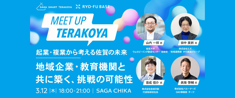 公益財団法人佐賀県産業振興機構 さが産業ミライ創造ベース(RYO-FU BASE)が主催する「IT人材起業・複業推進事業(SAGA Smart Terakoya)」の一環として、2026年3月12日(木)に、今年度の取組事例を紹介する「MEET UP TERAKOYA 起業・複業から考える佐賀の未来〜地域企業・教育機関と共に築く、挑戦の可能性〜」が開催されます。