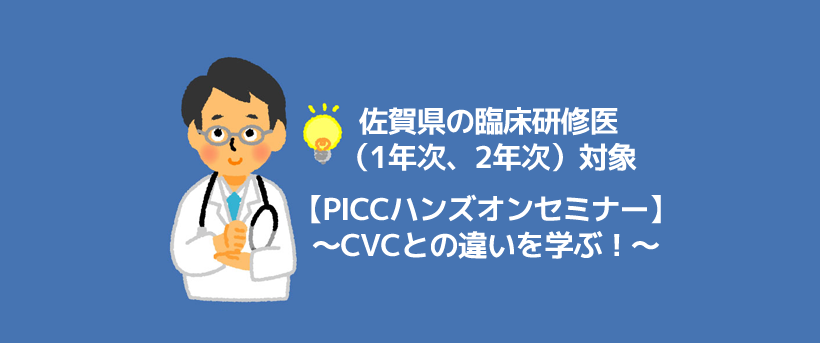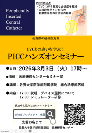 佐賀大学医学部では、佐賀県の医学生、研修医向け「SIRIUSプロジェクト」を実施しています。今回は臨床研修医(1年次、2年次)の方向けに、【PICCハンズオンセミナー】~CVCとの違いを学ぶ!~を開催します。PICCはCVCと比較して、機械的合併症のリスクが少なく、手技が比較的容易であること、感染率が低く、長期留置が可能となる等の利点があります。PICC留置を経験したことがない方もぜひこの機会に手技を身につけましょう。詳しい内容やお申し込みは下記をご覧ください。