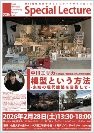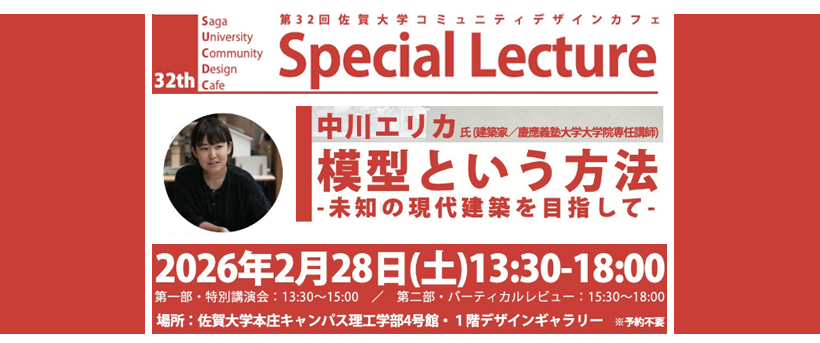 佐賀大学理工学部都市工学部門建築環境デザインコース・佐賀大学理工学部コミュニティデザイン研究会主催「第32回佐賀大学コミュニティデザインカフェ」開催のお知らせです。第1部では中川エリカ氏(慶應義塾大学大学院専任講師、一級建築士)を講師にお招きし、中川氏の近作についてご講演いただきます。また、第2部では3年生建築設計課題、卒業制作の優秀作品などを一堂に会したバーティカルレビューを行います。中川氏に加えて佐賀大学建築環境デザインコースの教員を交えての講評・意見交換を行います。事前申込不要・入場無料です。ぜひみなさまご参加ください。詳しくは下記をご覧ください。