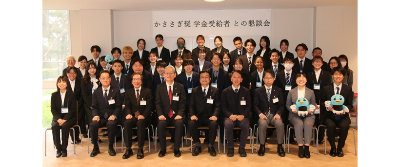 2025年2月19日に、「令和7年度かささぎ奨学生と学長・理事との懇談会」が大学会館内のみらいとルームで開催されました。例年、1年生を対象として開催していましたが、今年度は、野出学長のご意向により全学年を対象とし、総勢34名のかささぎ奨学生が参加しました。