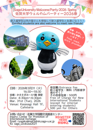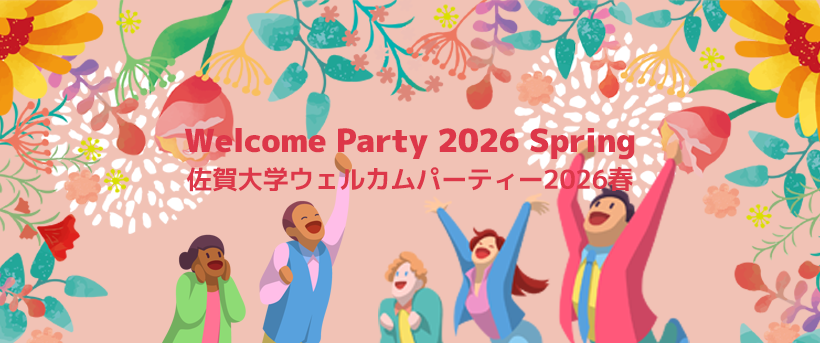佐賀大学国際交流推進センターより「Welcome Party 2026 Spring」開催のお知らせです。これは4月入学の留学生を歓迎するイベントです。お菓子・飲み物を準備しています!新入生の皆さんは佐賀大学で新たな生活の始まりと友人との出会いを楽しんでください!在校生の皆さんも大歓迎!新たに佐賀大学の友人として入学した留学生を温かく迎えて仲良くなりましょう!詳しい内容や参加方法は下記をご覧ください。