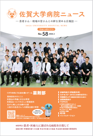 佐賀大学附属病院より「佐賀大学病院ニュース第58号」発行のお知らせです。58号では「くすりの向こうにある強いチーム 薬剤部」、「診療科紹介(呼吸器外科)」や「AI電話」のご紹介を掲載しています。また読者アンケートにもご協力ください。下記ページからPDFで閲覧できます。