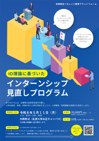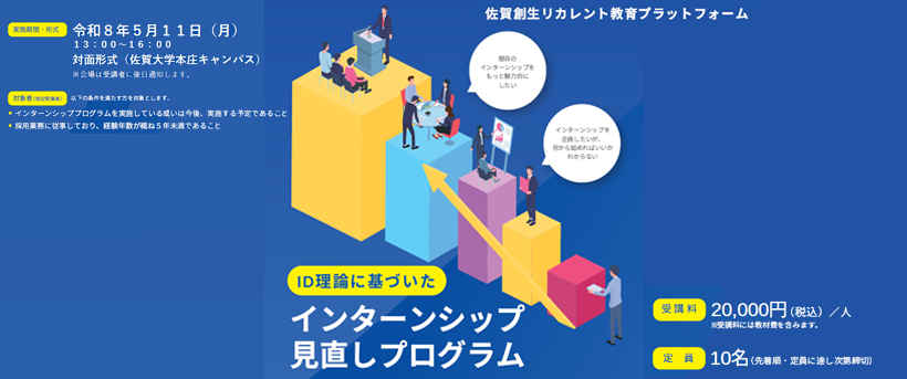 佐賀大学ウェルビーイング創造センターリカレント教育部門より、ID理論に基づいた「インターンシッププログラム見直しプログラム」開催のお知らせです。これは佐賀県内企業の若手採用・インターン担当者を対象としたもので、企業等の採用担当者を対象に、人材の採用・育成・定着を担う人材を育成することで、人材確保・育成機能の高度化を目的としたプログラムです。詳しい内容やお申し込みについては下記をご覧ください。申し込み締切りは5月1日です。