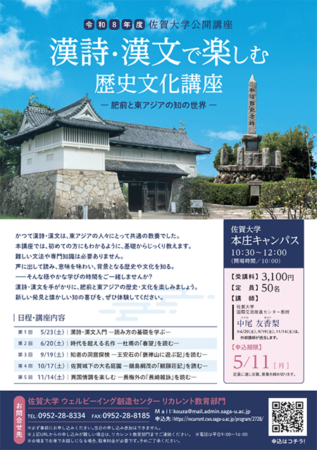 漢詩・漢文を手がかりに、肥前と東アジアの歴史・文化を楽しみましょう。新しい発見と懐かしい知の喜びを、ぜひ体験してください。申込期限は、2026年5月11日(月) です。詳しい内容や申し込みについては下記をご覧ください。