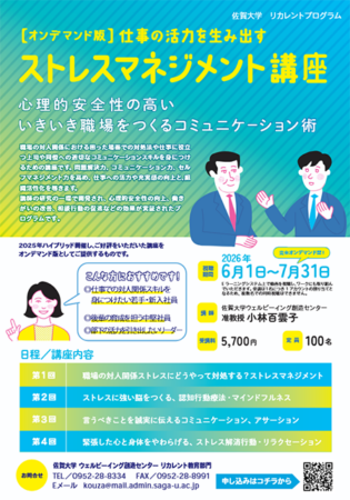 佐賀大学ウェルビーイング創造センターリカレント教育部門よりお知らせです。【オンデマンド版】仕事の活力を生み出すストレスマネジメント講座の受講生を募集しています。職場の対人関係の課題解決と適切なコミュニケーションスキルを習得。問題解決力、コミュニケーション力、セルフマネジメント力を高め、仕事の活力と組織活性化を促します。オンデマンド配信(講義+個人ワーク)形式ですので、いつでも・どこでも受講可能です。対象は新入社員からリーダー層までの幅広い社会人、対人関係で悩んでいる方、仕事のストレスを上手くマネジメントしたい方。申込期限は2026年5月18日(月)です。詳しい内容や申し込みについては下記をご覧ください。