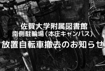 在学生、教職員のみなさんへ。佐賀大学附属図書館南側駐輪場(本庄キャンパス)放置自転車撤去のお知らせ