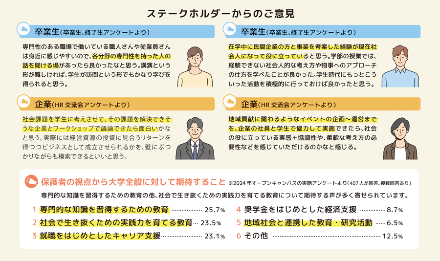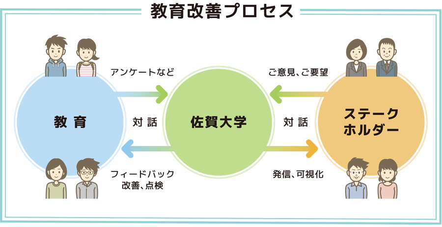 この方針のもと教育開発推進センターでは、ステークホルダーの方々と交流会を重ね、ご意見を聞き、その内容を教育の現場へとフィードバックしています。「地域社会の期待に応える人材の輩出」を佐賀大学の責任のひとつとして、日々活動を続けています。さらに教育の現場に近いステークホルダー(教員、職員、学生など)とも対話や意見交換を重ね、そこでの気づきを教育改善につなげることで、「学生一人ひとりが成長実感を得られる教育の実感を得られる教育」の実現を推進しています。