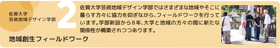 佐賀大学芸術地域デザイン学部は「芸術を通して地域創生に貢献する人材」を養成する学部です。2016年に新設され、佐賀県内の地域および地域に暮らす方々と深く関わりながら、芸術的な手法で地域をデザインすることを目的のひとつとしています。