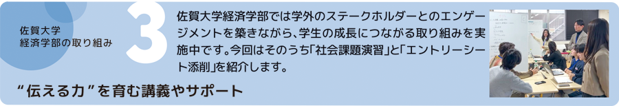 そこに集う、行政、民間企業、同窓会の方などのステークホルダーから「佐賀大学生は穏やかで優秀だけどおとなしい」「もっと積極的な発言がほしい」などの声を受けて、「社会課題演習」という講義を1年次後期必修科目に設置。「専門知識を用いたコミュニケーション能力の向上」と「他者に有効に伝えるための技術の向上」を目的として、教員および社会課題研究センターに関係性のある方などが教壇に立っています。