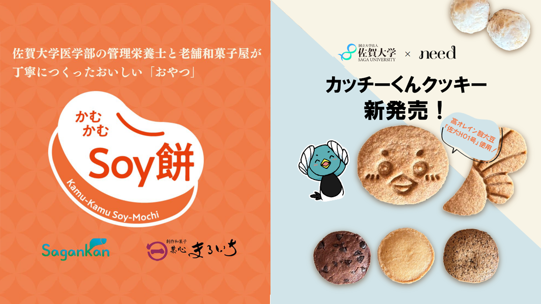 2026年春、佐賀大学と地域企業がコラボレーションして、大学オリジナルのお菓子が二種類が登場しました!佐賀大学医学部 管理栄養士と老舗「創作和菓子 菓子まるいち」様による「かむかむSoy餅」。佐賀大学広報室と「76pain」系列の人気カフェ「need」様との「カッチーくんクッキー」。どちらも佐賀大学で研究・開発された高オレイン酸大豆「佐大HO1号」を使用しています。